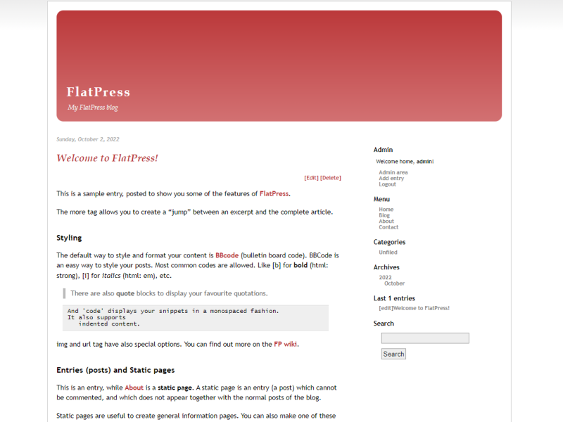 Statische Seiten lassen sich prima für generelle Informationen einsetzen, zum Beispiel eine feste Startseite oder das Impressum. Man könnte sogar komplett auf die Blog-Funktionen verzichten und mit FlatPress eine Website mit ausschließlich statischen Seiten erstellen.